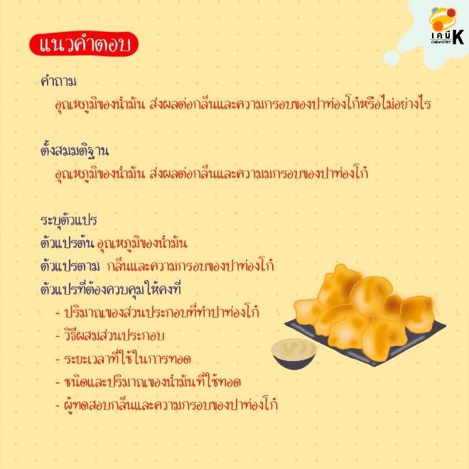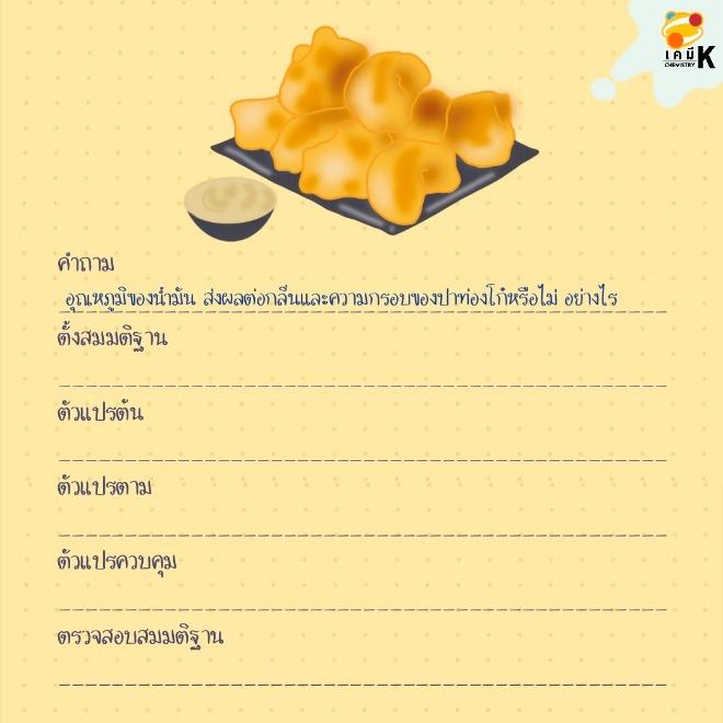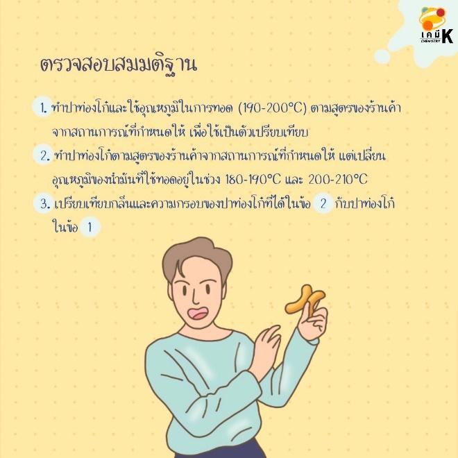 พอเข้าใจหลักการของ 5 ขั้นตอนทางวิทยาศาสตร์หรือยังครับ? เราไปดูตัวอย่างให้เข้าใจมากขึ้นกัน พี่ขอเริ่มจากการสังเกตสิ่งรอบตัว เป็นปัญหาที่เราเจอในชีวิตประจำวัน นั่นคือ “ปาท่องโก๋มีกลิ่นเหม็นฉุนของน้ำมัน”