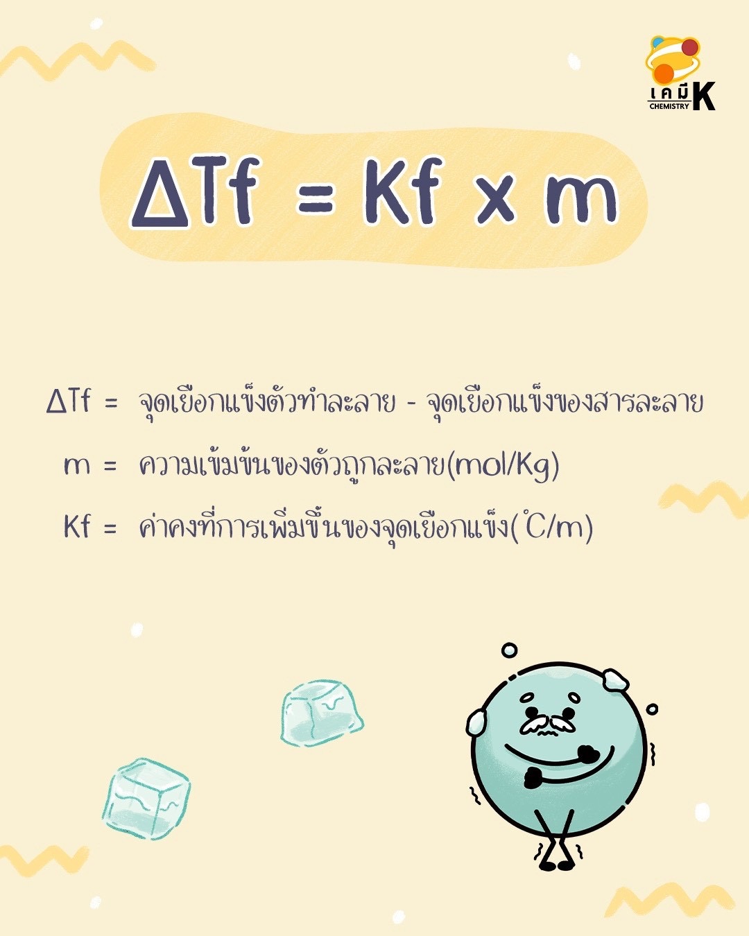 ส่วนฝั่งจุดเยือกแข็ง คือเมื่อเติมตัวละลายในหน่วยโมแลลจะทำให้จุดเยือกแข็งของสารละลายลดลงเมื่อเทียบกับจุดเยือกแข็งของตัวทำละลายบริสุทธิ์ โดยมีสูตรตามภาพนี้เลย