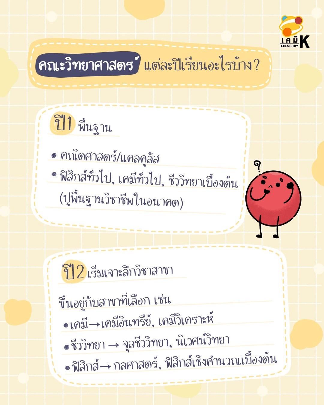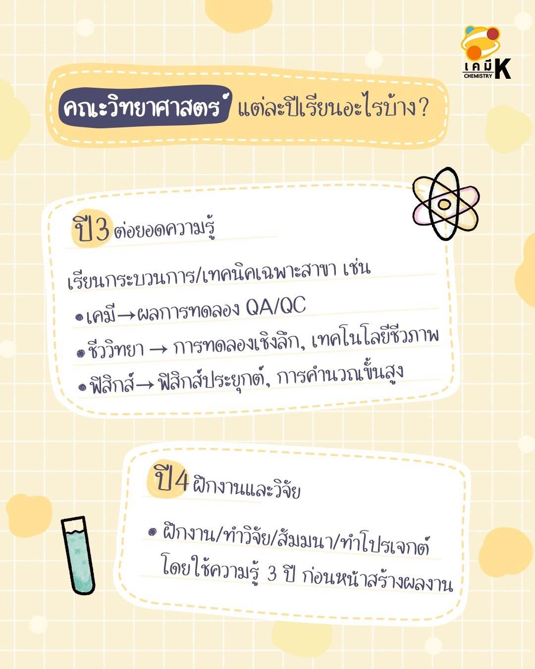คณะวิทยาศาสตร์ปี 2 : เมื่อขึ้นปี 2 น้องจะได้เรียนเกี่ยวกับวิชาสาขาของตัวเองมากขึ้น เช่น เคมี ก็จะได้เรียน