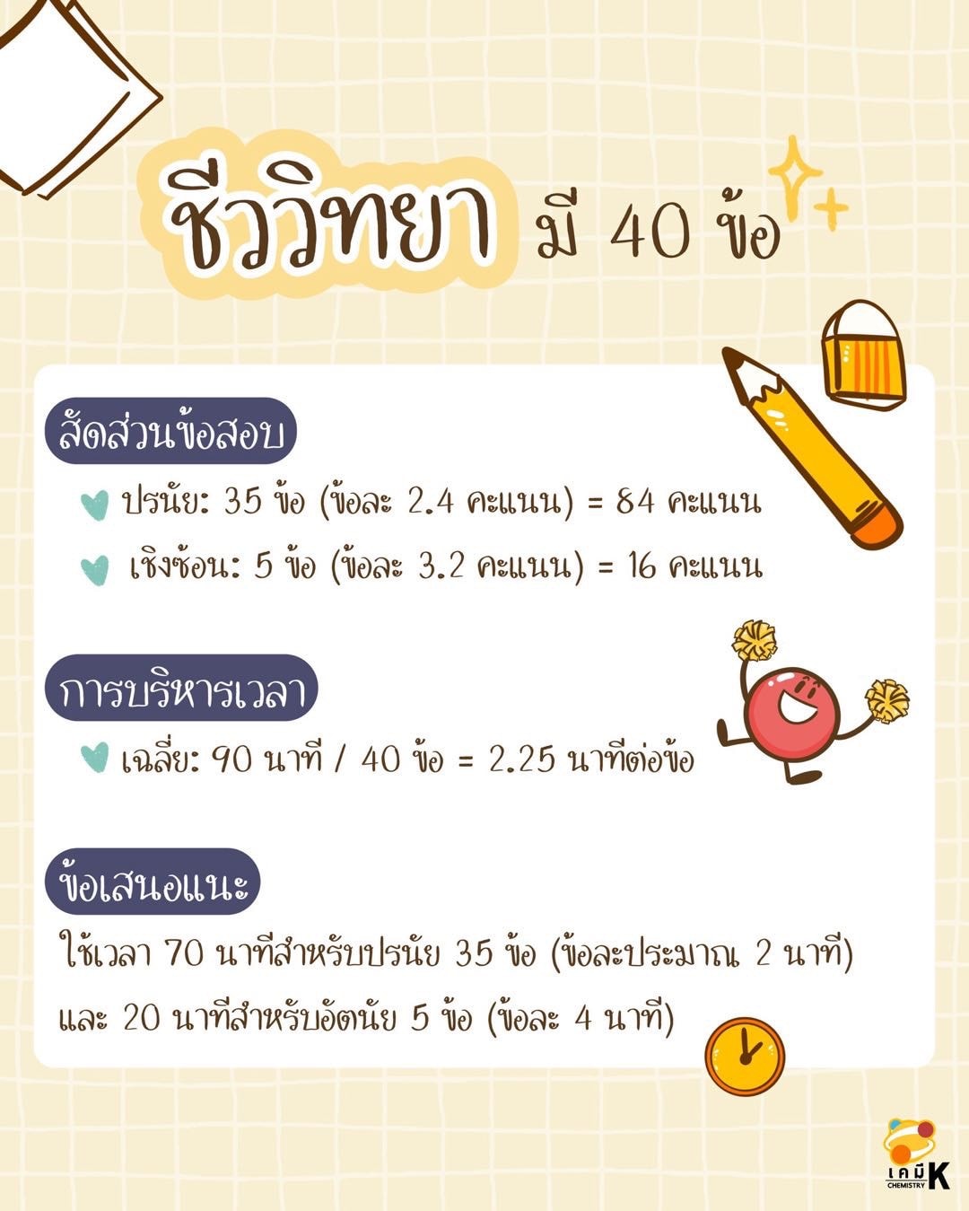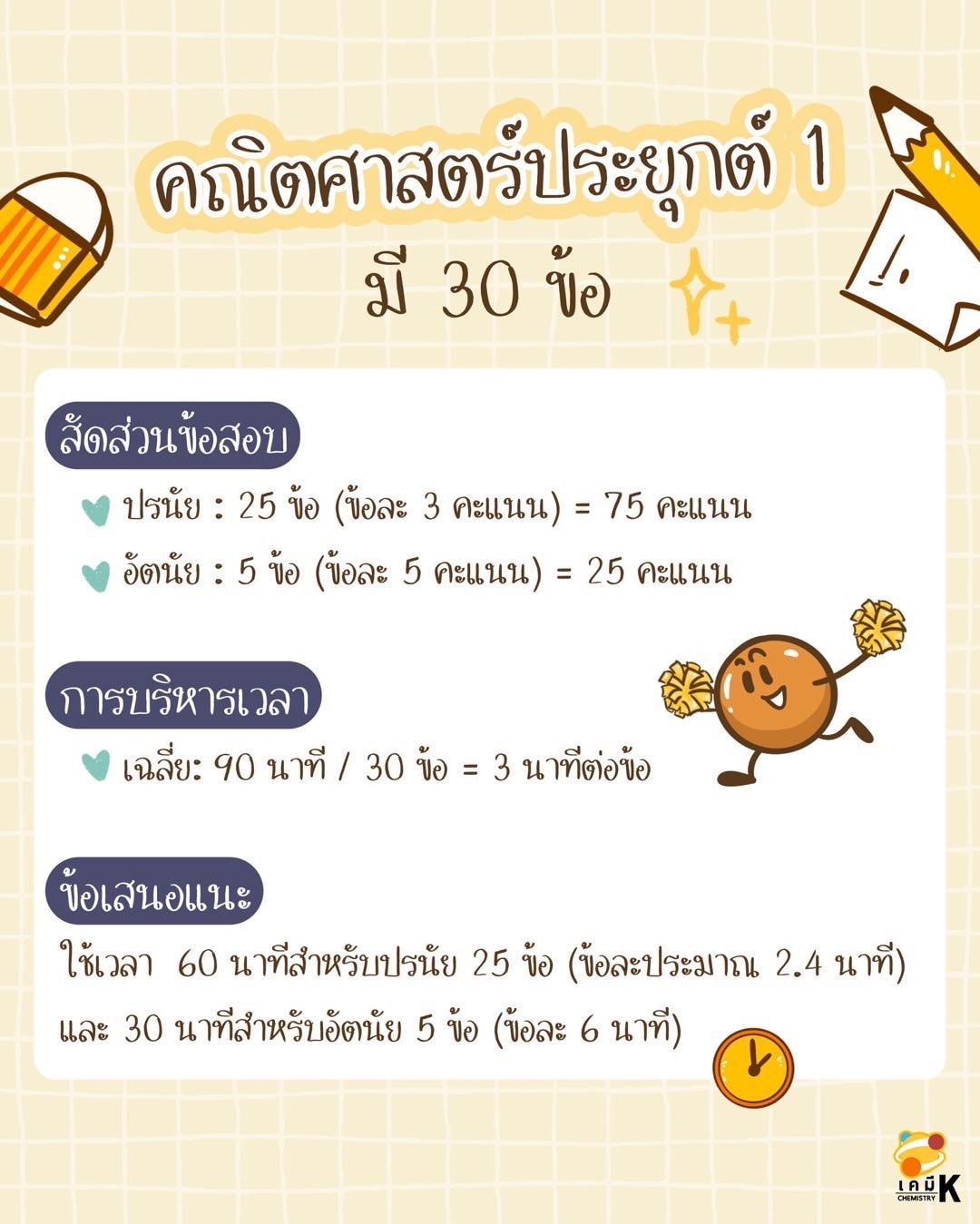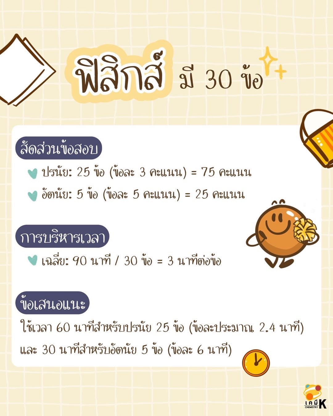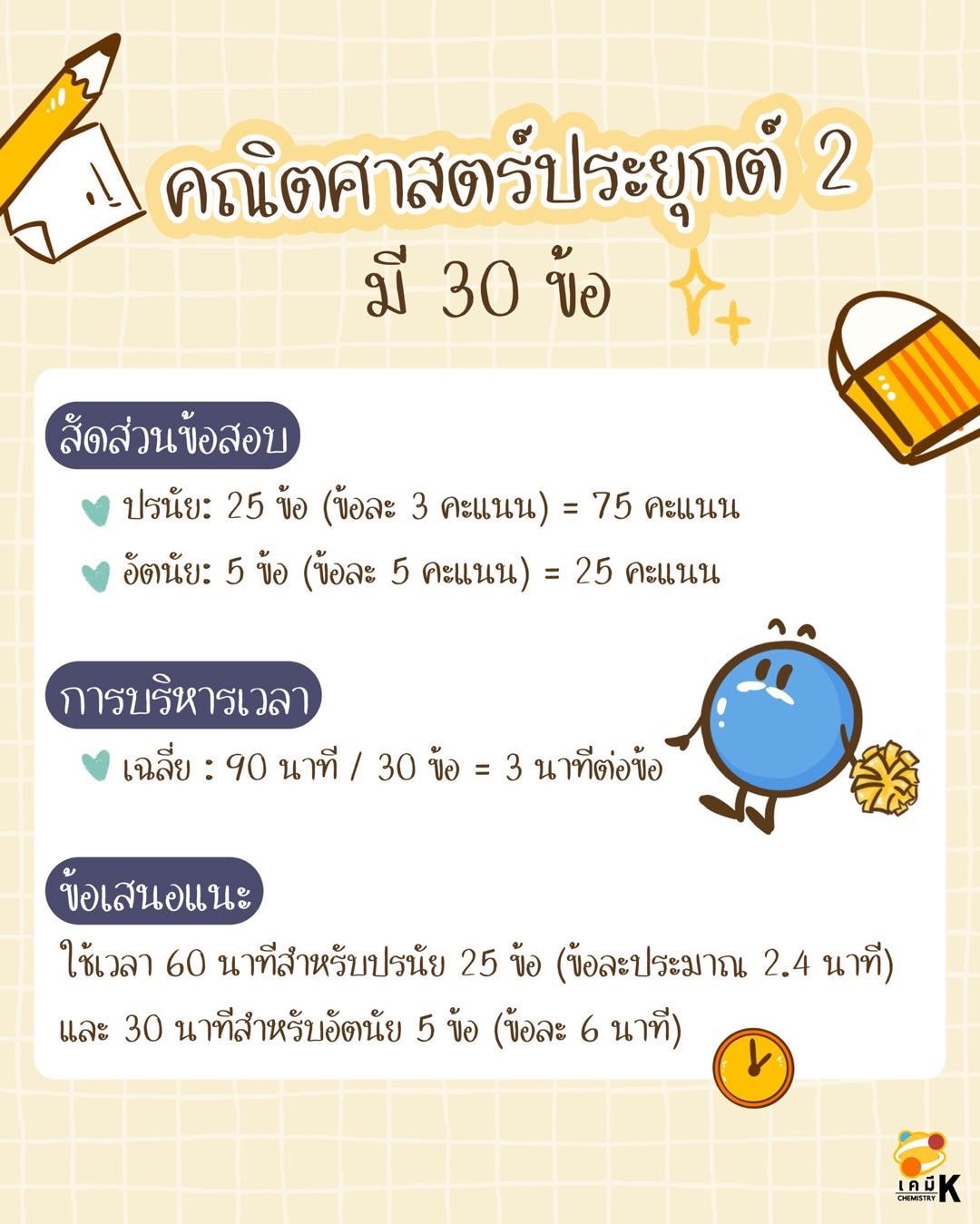 ทริก : 60 นาทีสำหรับปรนัย 25 ข้อ และ 30 นาที สำหรับอัตนัย 5 ข้อ