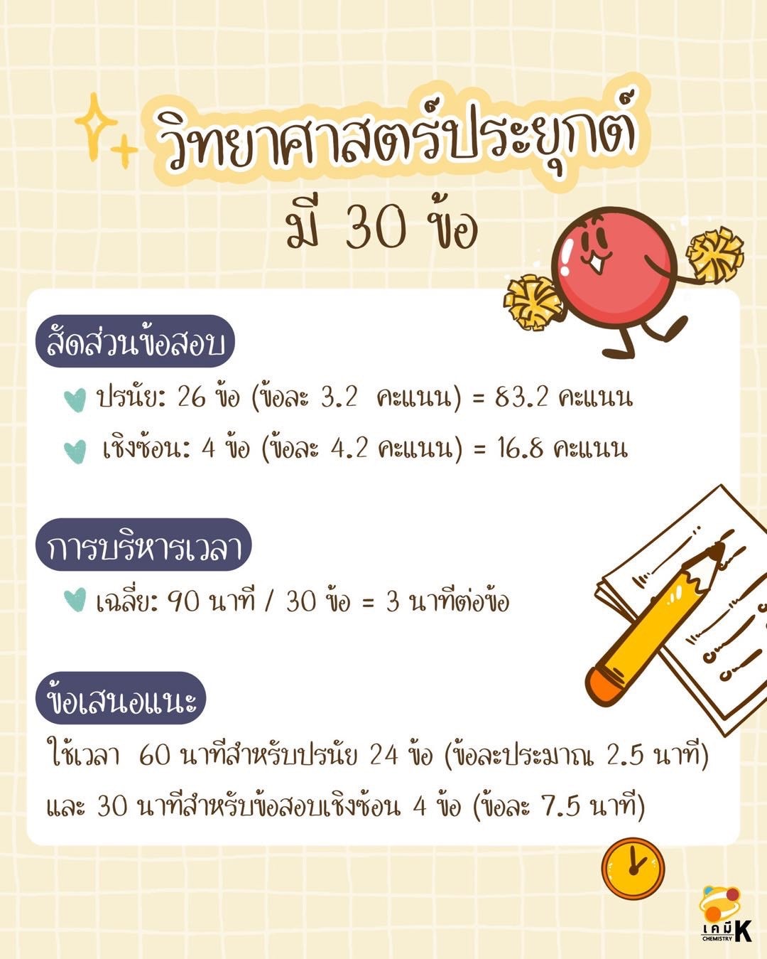 ทริก : 60 นาทีสำหรับปรนัย 24 ข้อ และ 30 นาที สำหรับอัตนัย 4 ข้อ