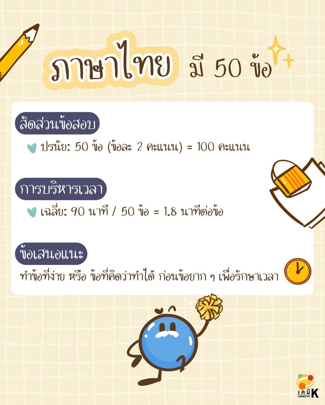 ภาษาไทย มี 50 ข้อ 90 นาที ( 1.8 นาทีต่อข้อ )