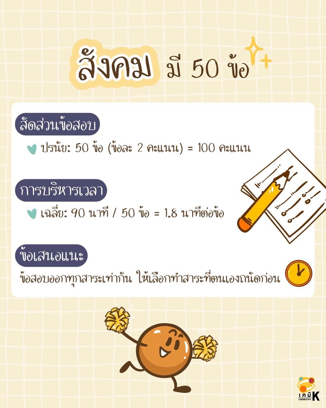 สังคม มี 50 ข้อ 90 นาที ( 1.8 นาทีต่อข้อ )